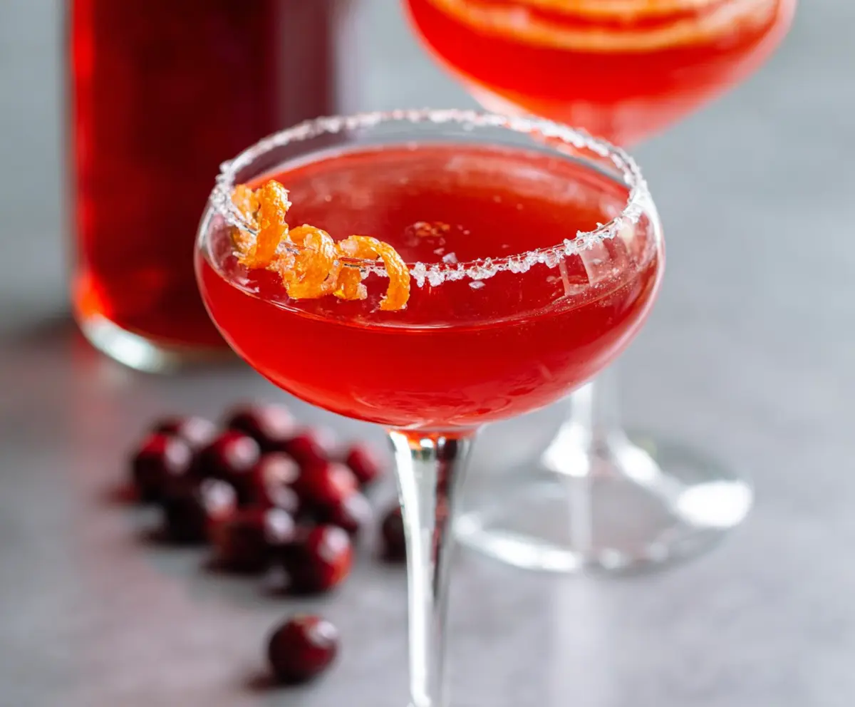 This cocktail beautifully showcases a deep red hue from the cranberry juice, with the orange zest twist adding a bright pop of color. The sparkling sugared rim enhances its festive appeal. Enjoy your drink and have a great time!