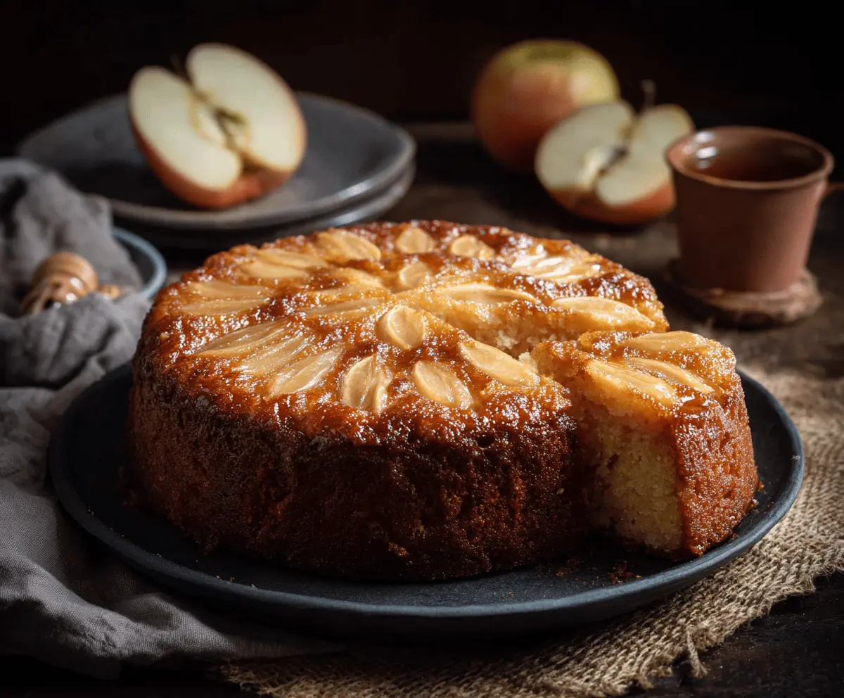 A cozy upside-down style apple honey cake with tender apples on top, a moist honey-sweetened crumb, and a glossy honey glaze that makes every slice shine.