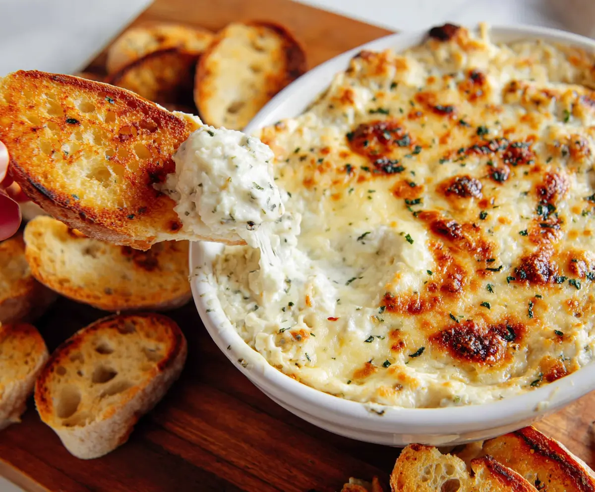 Once it’s out of the oven, sprinkle some fresh chopped parsley on top for a pop of color. Serve the dip hot with your toasted baguette slices. Get ready to dig into this warm, cheesy delight!