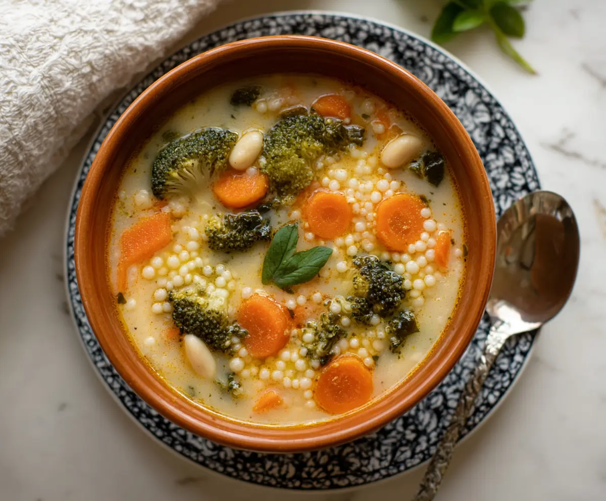 This soup is hearty and packed with wholesome ingredients. Enjoy the warm, filling goodness of your Broccoli and Carrot Couscous Soup!