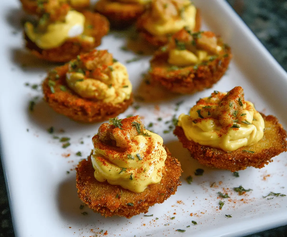 Once cooked, remove the fried deviled eggs using a slotted spoon and let them drain on paper towels to get rid of excess oil. Before serving, sprinkle them with smoked paprika and chopped fresh parsley for a lovely touch.