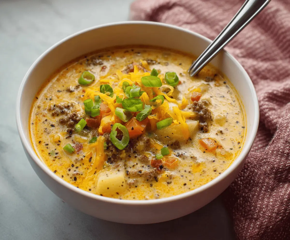 Cheeseburger Soup is a warm and cozy meal that brings all the best flavors of a cheeseburger into a creamy bowl. It’s packed with ground beef, cheese, and topped with pickles for that classic taste!
