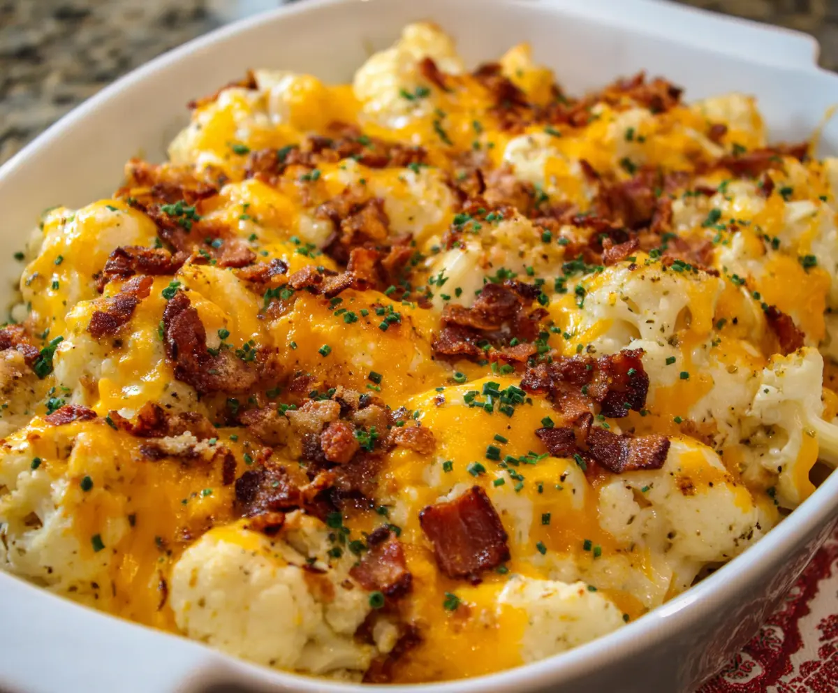 This Cheesy Loaded Cauliflower Casserole is a tasty dish packed with flavor! It features tender cauliflower covered in creamy cheese, crispy bacon, and chives for a delightful mix.