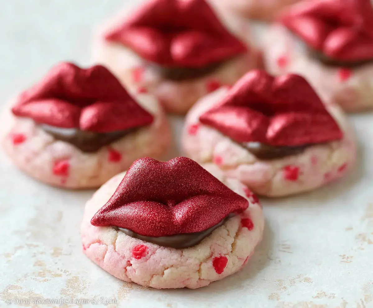 As soon as you take the cookies out of the oven, press a red chocolate lip candy on top of each cookie. Push down gently so it sticks, but be careful not to melt it too much.