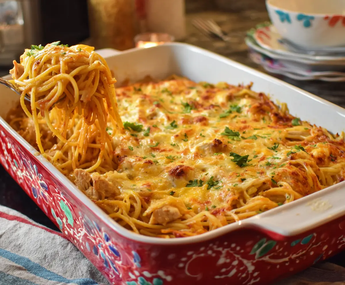 This Chicken Spaghetti Bake is a cozy dish made with tender chicken, spaghetti, and creamy sauce. It bakes up bubbly and golden, making your kitchen smell wonderful!