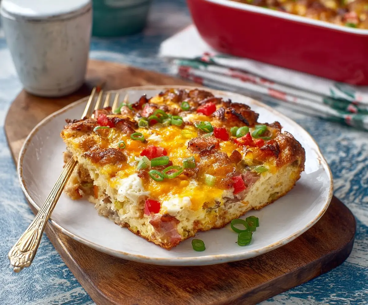 This hearty, festive casserole brings colorful red and green bell peppers and green onions for a Christmas touch, with savory sausage and bacon adding delicious flavor. The eggs and cheese bind everything into a moist, fluffy dish perfect for holiday mornings!