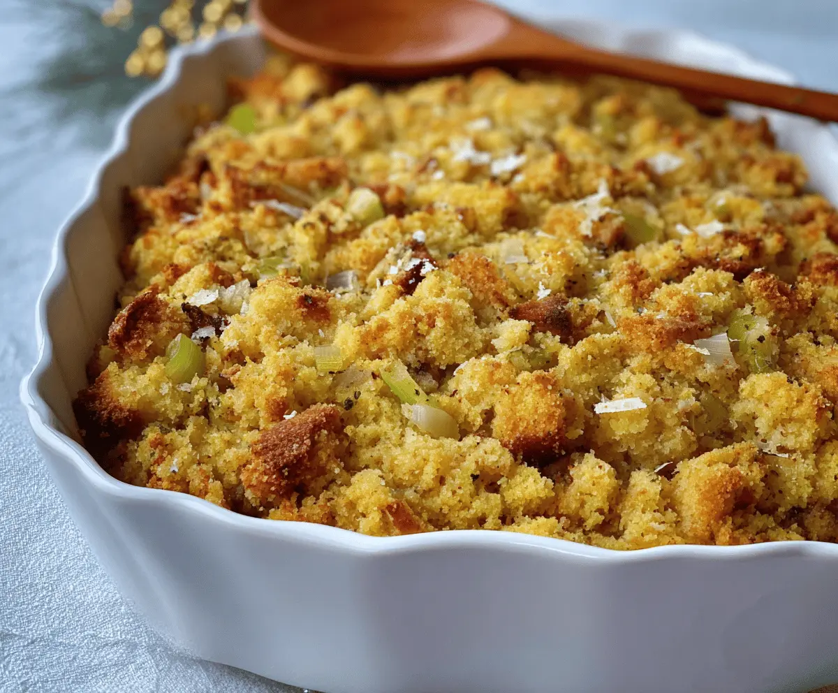 Cornbread dressing made with fluffy crumbled cornbread, sautéed veggies, and cozy herbs—perfectly moist inside with a golden, crunchy top for your holiday table.