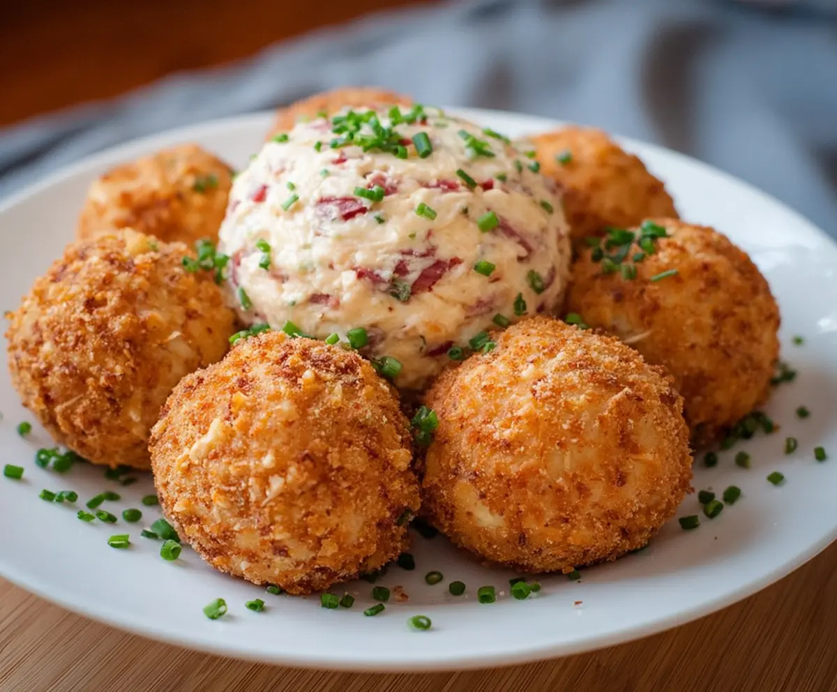 Finally, garnish with extra chopped chives for a fresh touch. Serve warm and enjoy your crispy, cheesy corned beef and cheese balls with the delicious creamy dip!