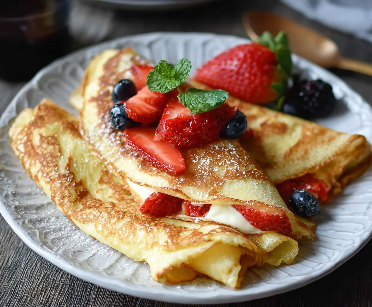Place the filled crepes on a serving plate. Top with fresh strawberry slices, blueberries, and a light dusting of powdered sugar to make them look pretty. Serve immediately while they’re warm, and enjoy this delicious treat!