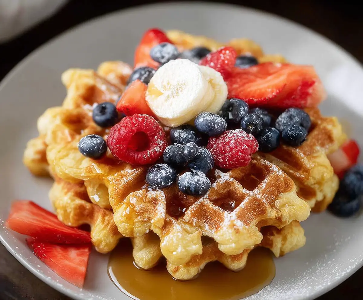 Carefully remove the waffles from the iron and place them on a serving plate. Top them with fresh strawberries, blueberries, and banana slices. Finally, drizzle generously with maple syrup and dust with powdered sugar for an elegant touch.