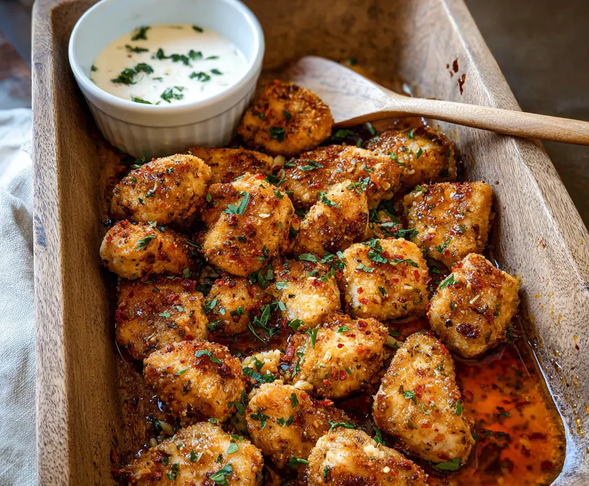 Transfer the chicken bites and all the buttery sauce to a serving dish. Garnish with a little extra chopped parsley on top for a pop of color. Serve these warm with ranch or your favorite creamy dipping sauce on the side.