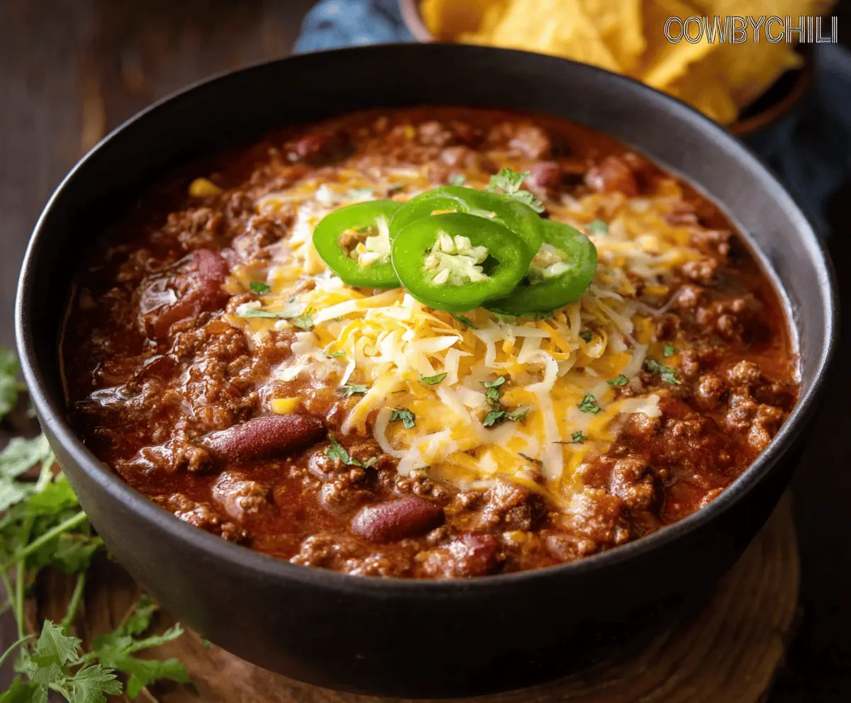 Serve the chili hot, garnished with shredded cheddar cheese, slices of fresh jalapeños, and a sprinkle of cilantro or parsley on top. Enjoy your hearty bowl of Cowboy Chili—perfect for cozy nights in or gatherings with friends!