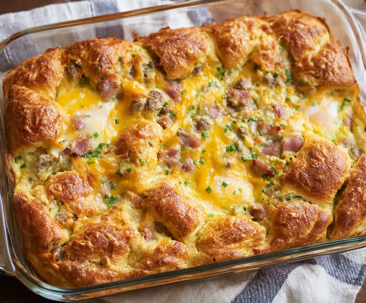 This warm and comforting breakfast casserole features flaky crescent rolls topped with eggs, cheese, and your choice of meat. It’s a hearty start to your day!