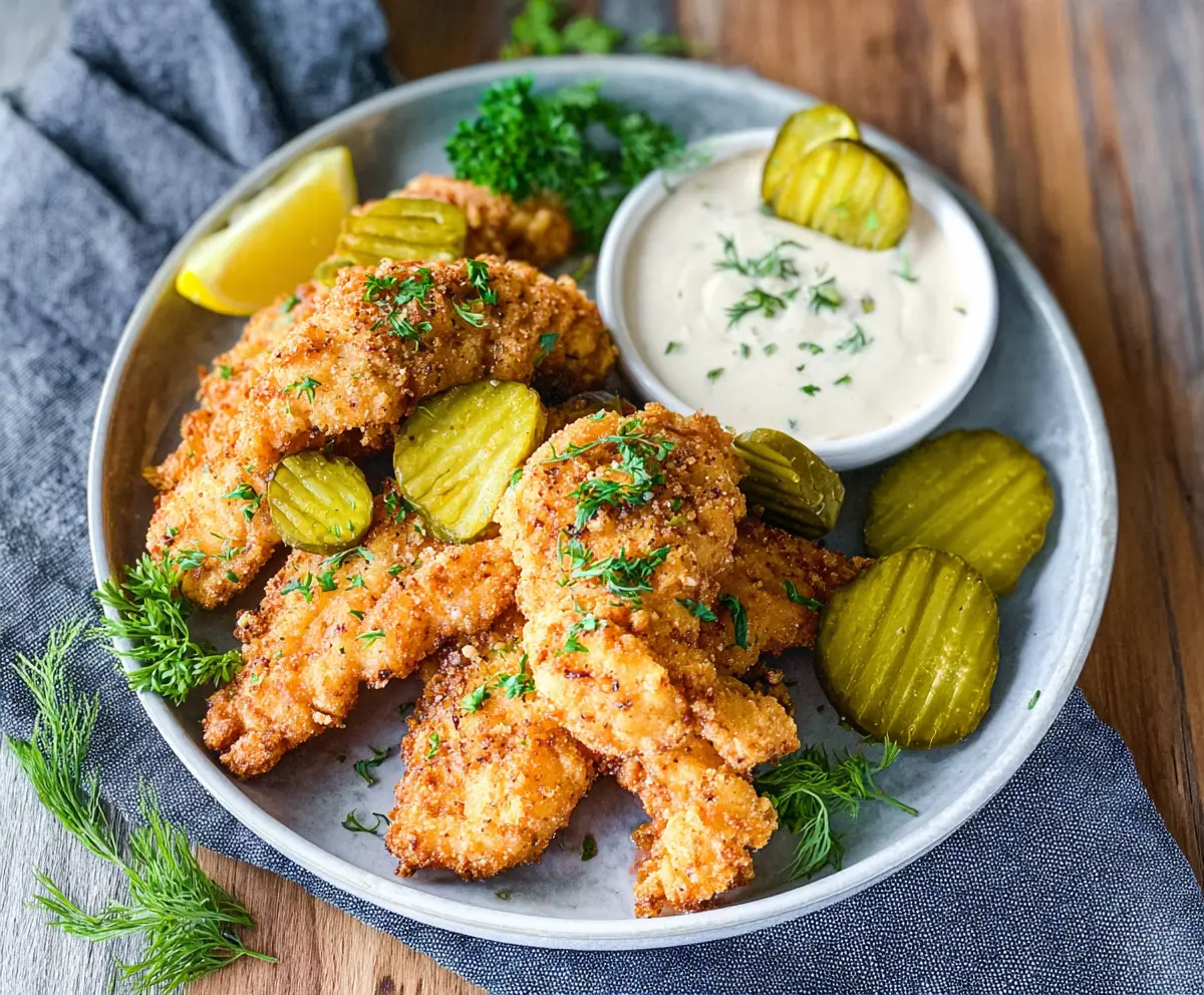 Once your chicken is ready, arrange the crispy tenders on a plate. Garnish with fresh dill if you like for a little extra flavor. Don’t forget to serve some dill pickle slices and the delicious dill pickle ranch dip on the side. Enjoy your crispy, tangy Dill Pickle Ranch Chicken Tenders!