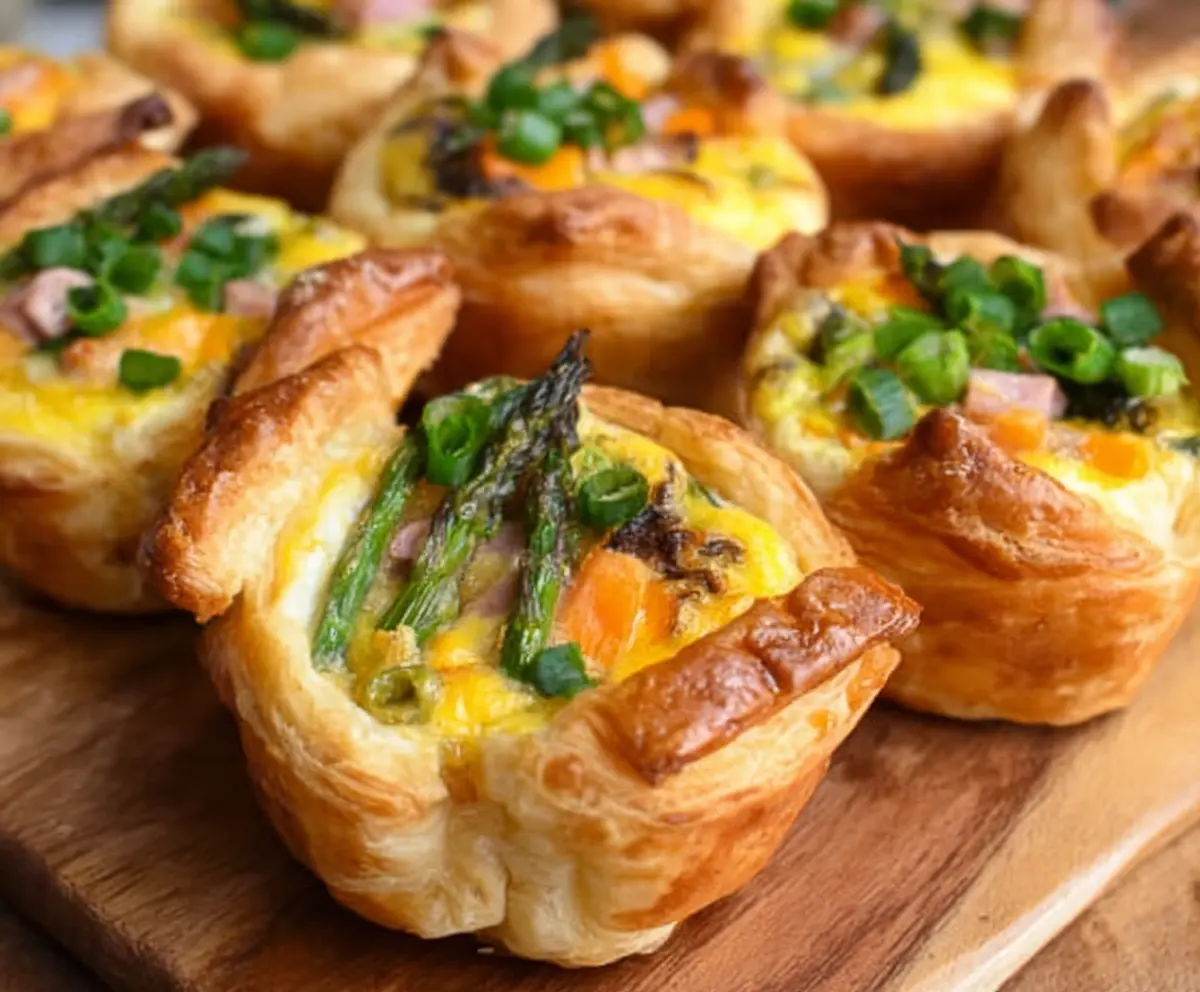 These bite-sized quiche cups with flaky puff pastry, vibrant vegetables, ham, and cheese are perfect for celebrating Easter. Enjoy!