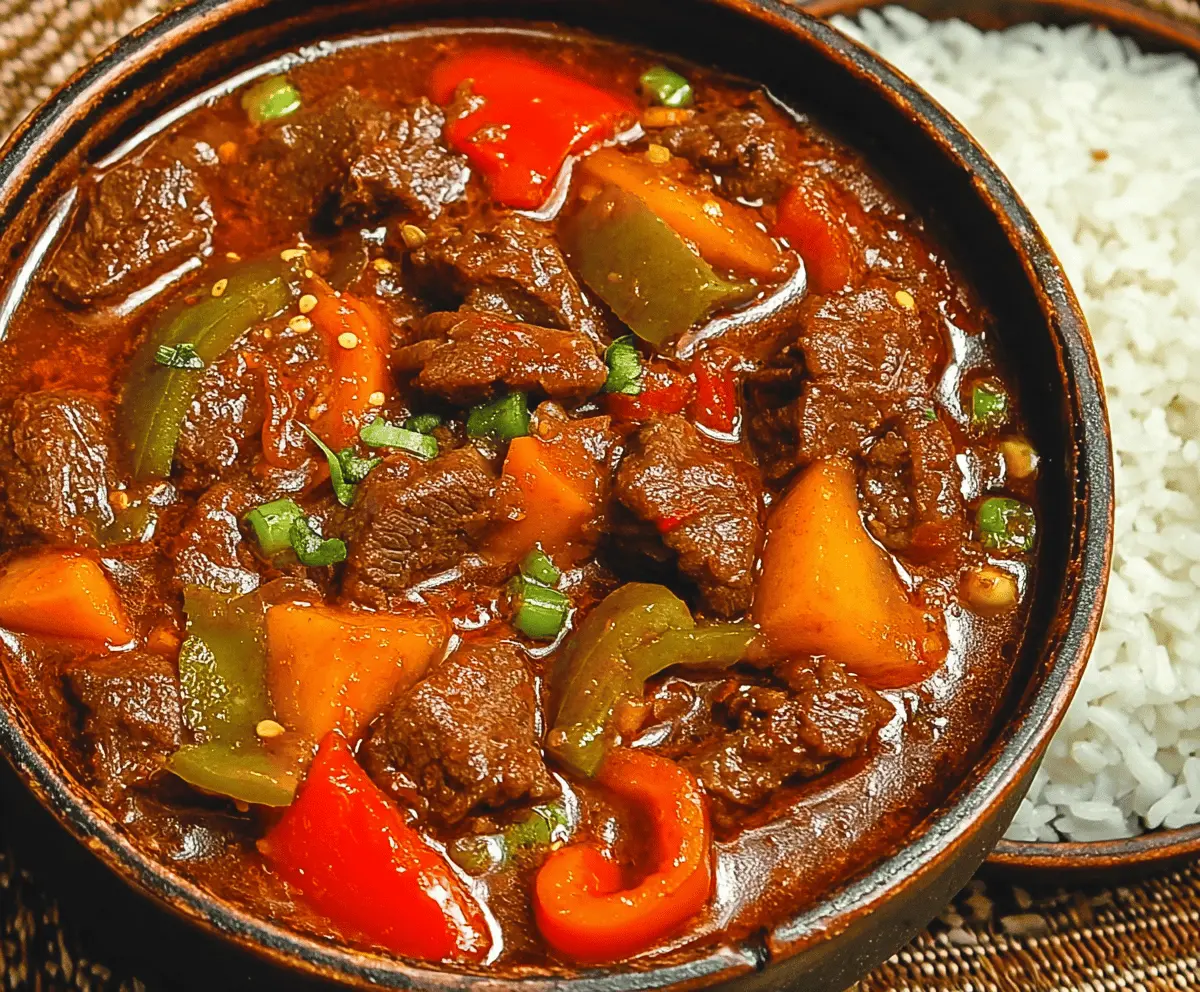 A rich, tomato-based Filipino beef stew with tender beef, hearty vegetables, bell peppers, peas, and a savory hint of liver spread—perfect served over steamed rice.