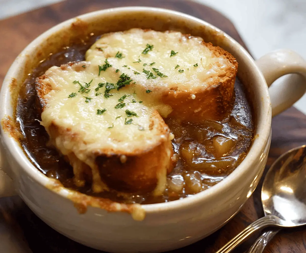 This cozy French Onion Soup is all about warm, rich flavors. It’s made with sweet caramelized onions, savory broth, and topped with melted cheese and toasted bread.