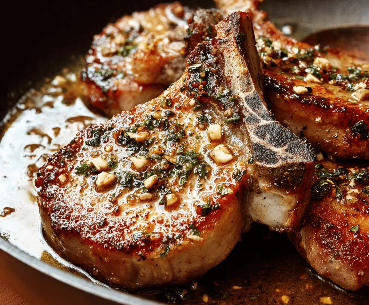 - Return the seared pork chops and any juices from the plate back into the skillet. Spoon the garlic butter sauce over the chops and let them cook for another 2–3 minutes, or until they reach an internal temperature of 145°F (63°C).