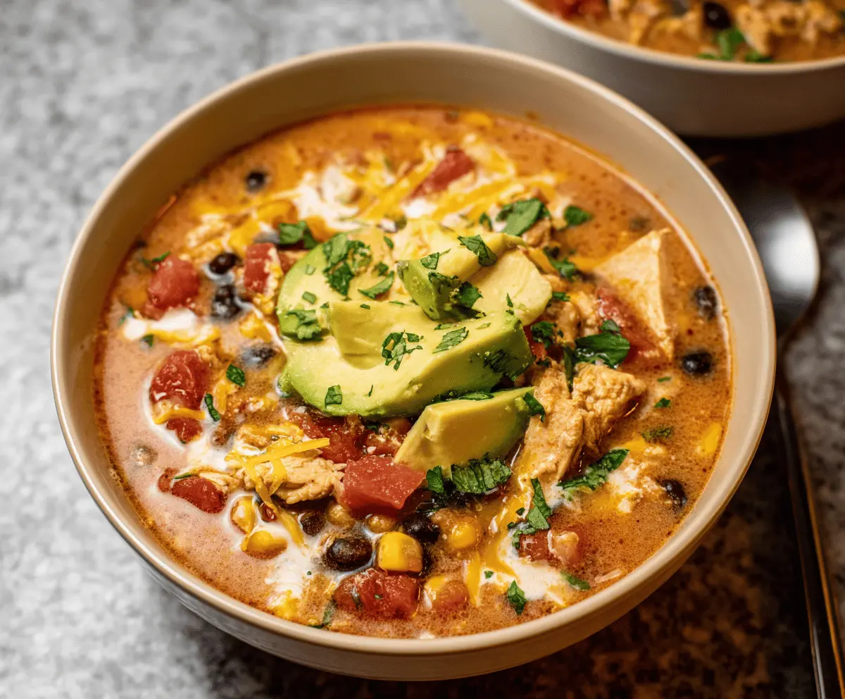 When you’re ready to serve, ladle the hot soup into bowls. Top each serving with a sprinkle of shredded cheddar cheese, diced avocado, a dollop of sour cream, chopped cilantro, and crunchy tortilla chips or strips for that delightful texture!