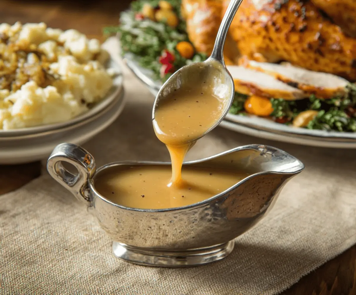 Smooth, flavorful turkey gravy made from pan drippings, broth, and a simple roux—perfect for pouring over roast turkey, mashed potatoes, and all your holiday sides.