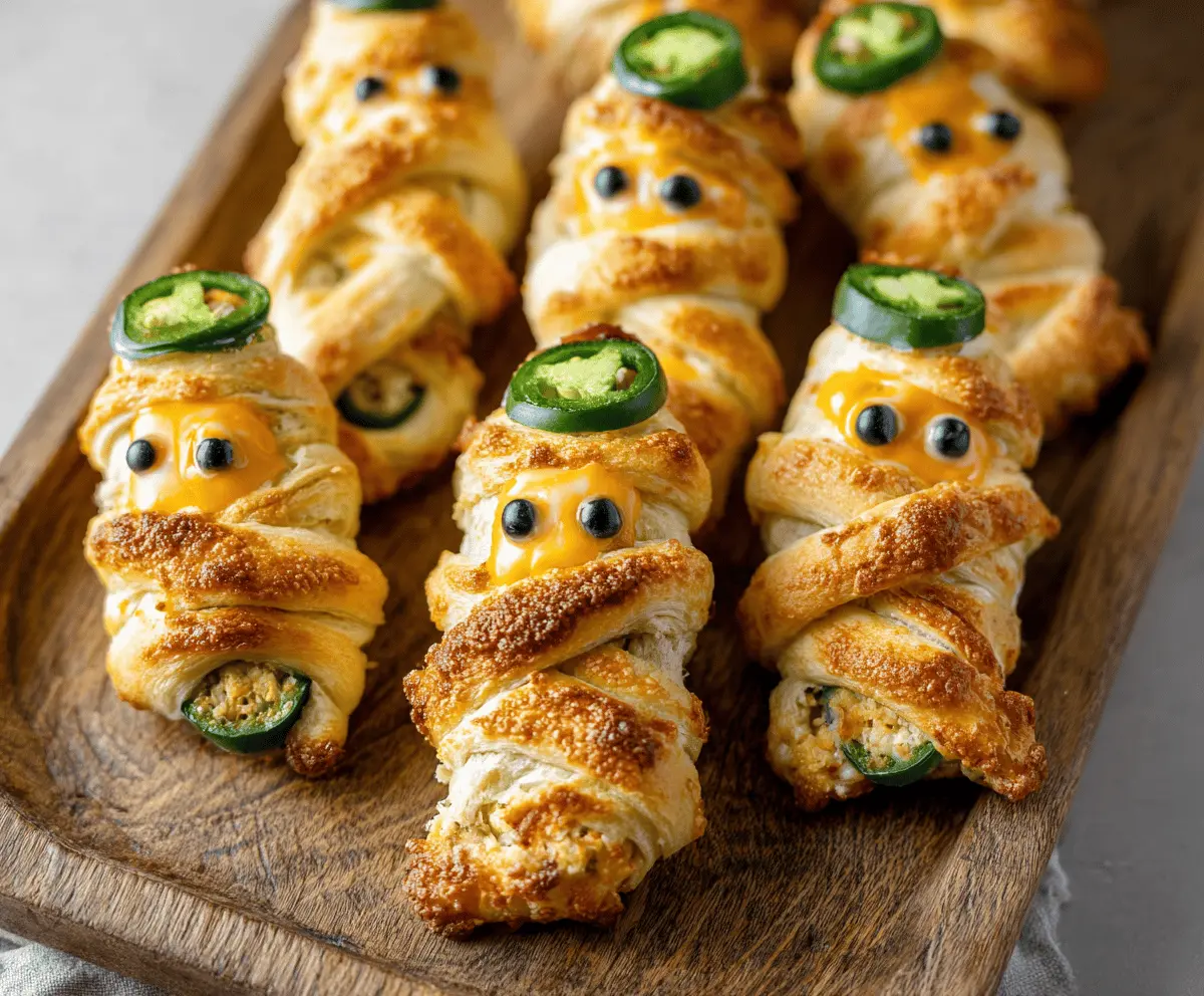 These fun Jalapeño Popper Mummies are a tasty twist on a Halloween treat! They combine spicy jalapeños, creamy cheese, and crispy dough, all wrapped up like little mummies.