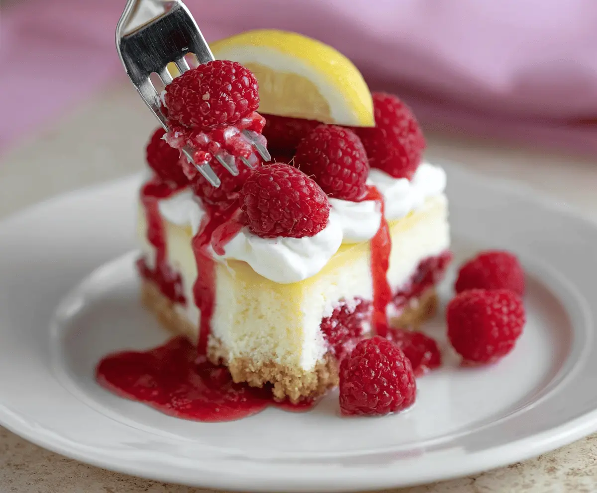Now, cut your cheesecake into squares or slices and serve chilled. Each bite is a delightful mix of creamy lemon flavor balanced with the sweet-tart raspberry topping — enjoy every little crumb of this delicious masterpiece!