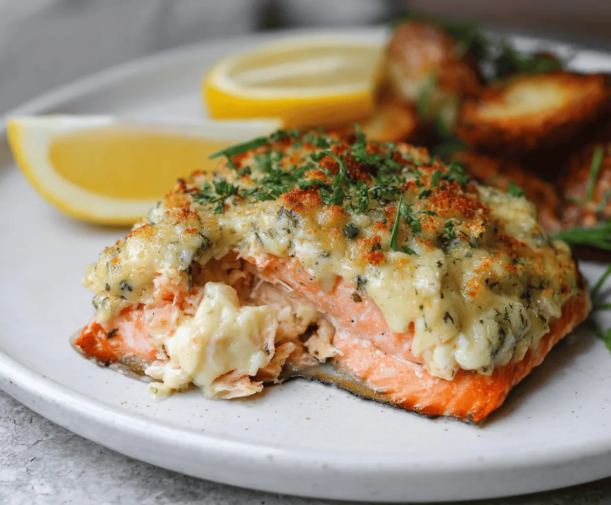 Place the stuffed salmon fillets into your prepared baking dish. Brush the tops and sides with olive oil or melted butter, then sprinkle with a little salt and pepper for extra flavor. Pop the dish into the oven and bake for about 18-22 minutes. You’ll know it’s done when the salmon flakes easily with a fork and the crab topping is just starting to get golden brown.