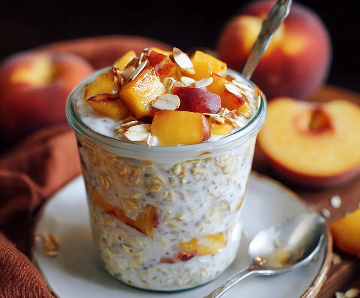 When you’re ready to eat in the morning, give the oats a gentle stir. If they’re a bit thick, you can add a splash more milk to loosen them up. Top with fresh peach slices and a sprinkle of sliced almonds or extra oats for some crunch. Now dig in and enjoy your delicious peaches and cream overnight oats, chilled and sweet!