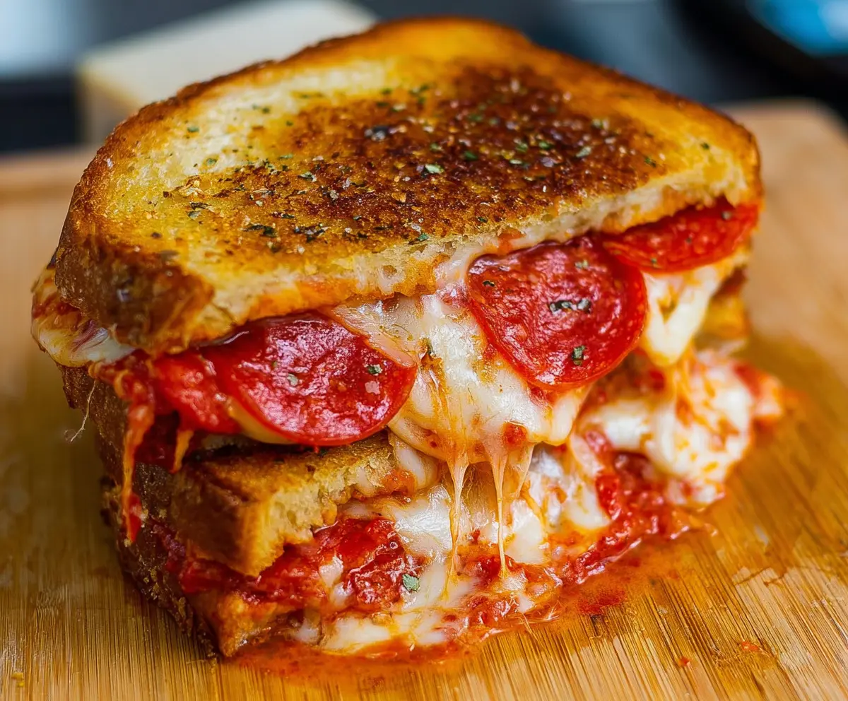 This tasty sandwich combines the best of both worlds—crispy buttered bread and melty pizza flavors. Perfect for a quick lunch or an indulgent snack!