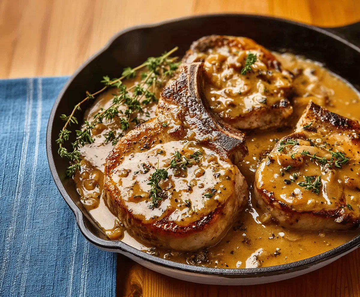 Plate the pork chops, smothering them in that savory gravy, and garnish with fresh thyme or parsley. This dish is perfect paired with mashed potatoes and green beans for a fantastic comfort meal!