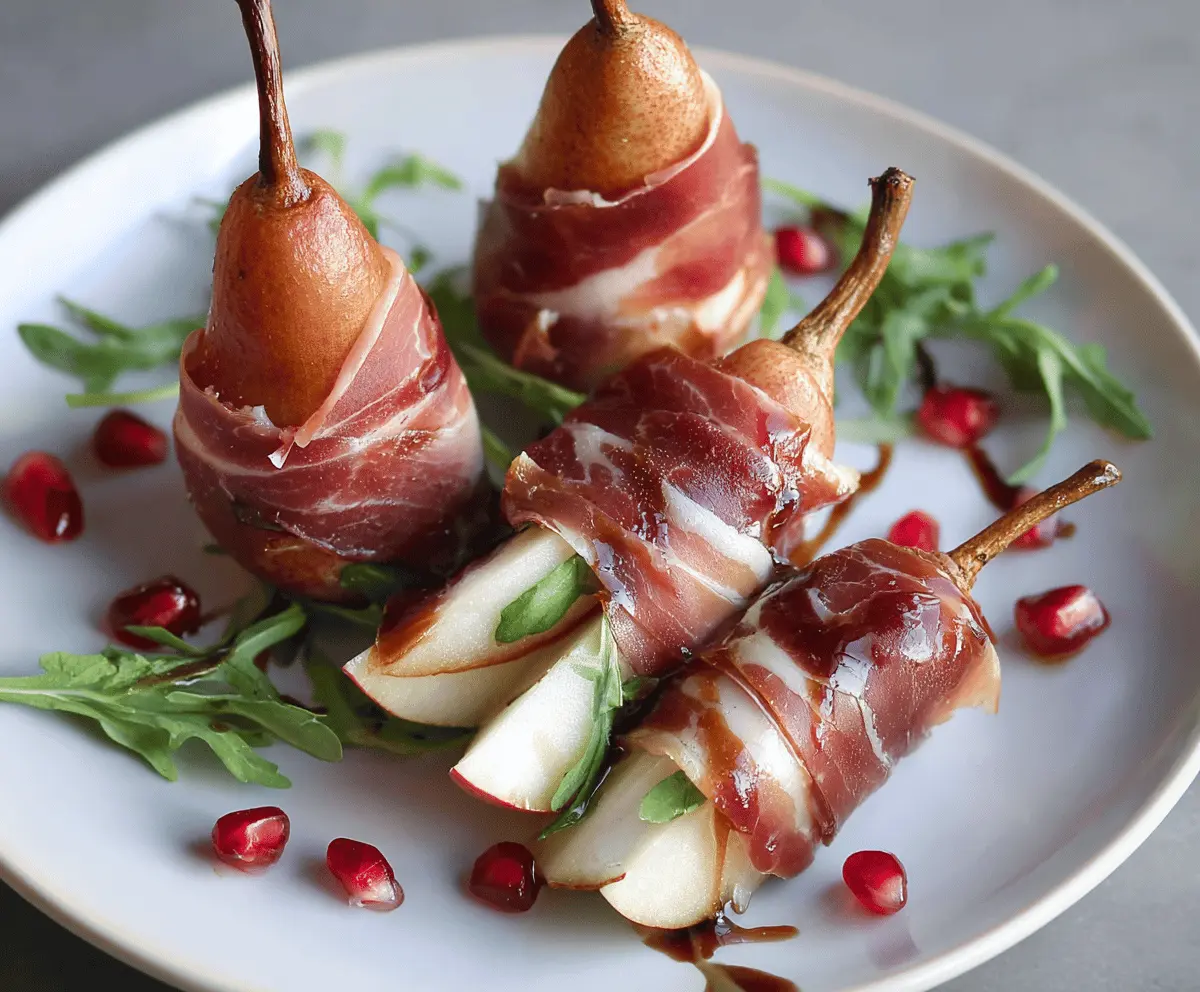 These prosciutto wrapped pears are a tasty blend of sweet and salty. The juicy pears are hugged by thin, savory slices of prosciutto, making them a treat for your taste buds!