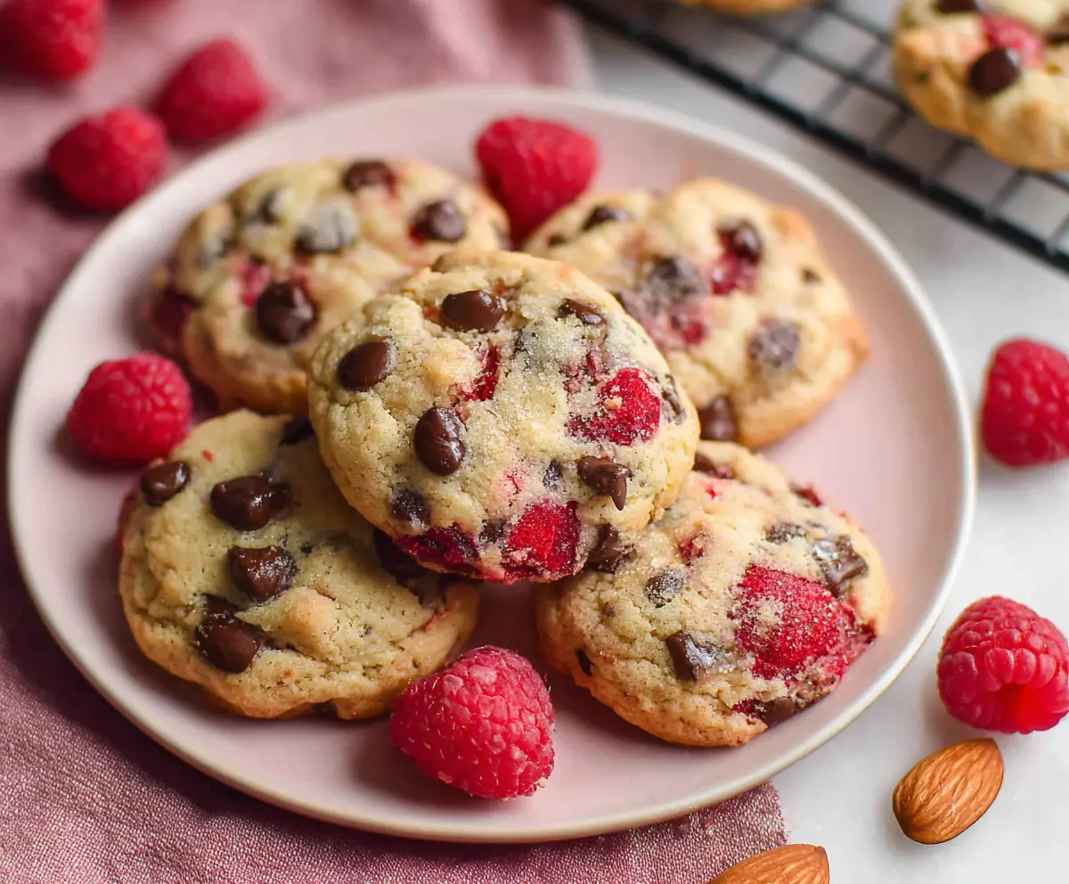 Your delightful Raspberry Almond Chocolate Chip Cookies are ready to be savored! Serve them warm or store them in an airtight container for later. Enjoy every delicious bite!