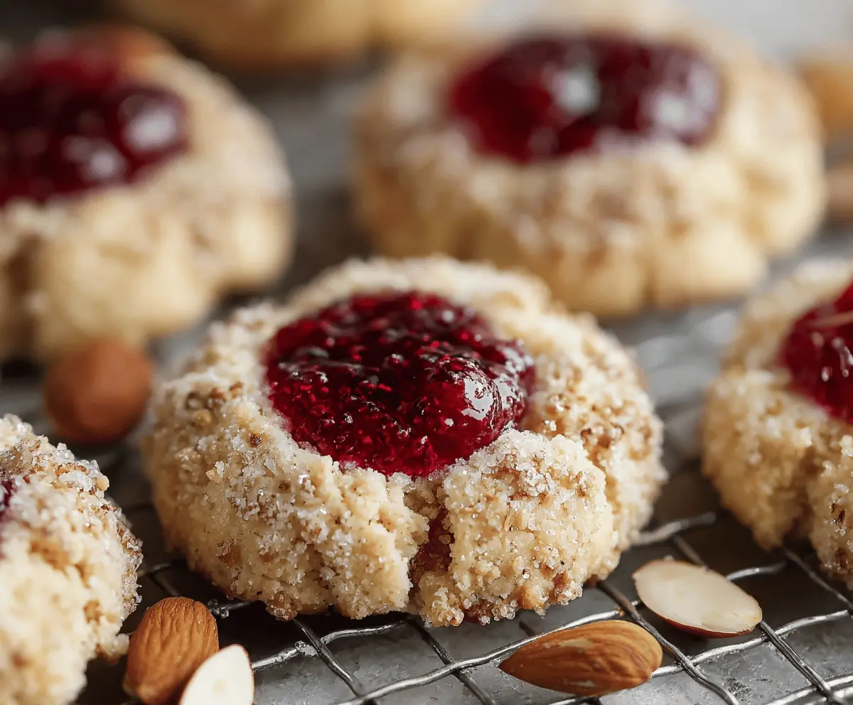 Once baked, remove the cookies from the oven and let them cool on the baking sheet for about 5 minutes. Then, carefully transfer them to a wire rack to cool completely. Enjoy your delightful raspberry and hazelnut thumbprint cookies!