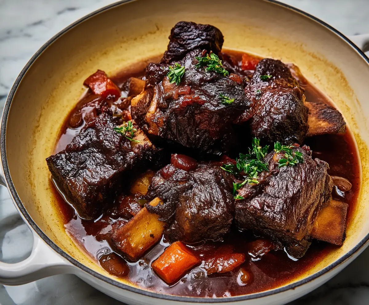 Once done, remove the pot from the oven and take out the short ribs to keep them warm. Discard the herb sprigs and bay leaves. If you prefer a thicker sauce, whisk 1 tablespoon of flour with a bit of cold water to create a slurry, stir it into your sauce, and let it simmer until thickened.