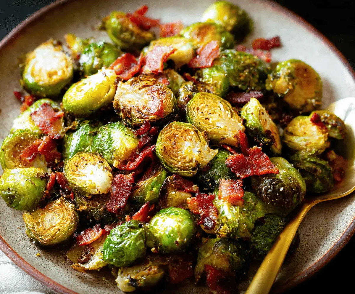 Crispy roasted Brussels sprouts tossed with savory bacon, olive oil, salt and pepper—an easy and flavorful side dish ready in under 30 minutes.