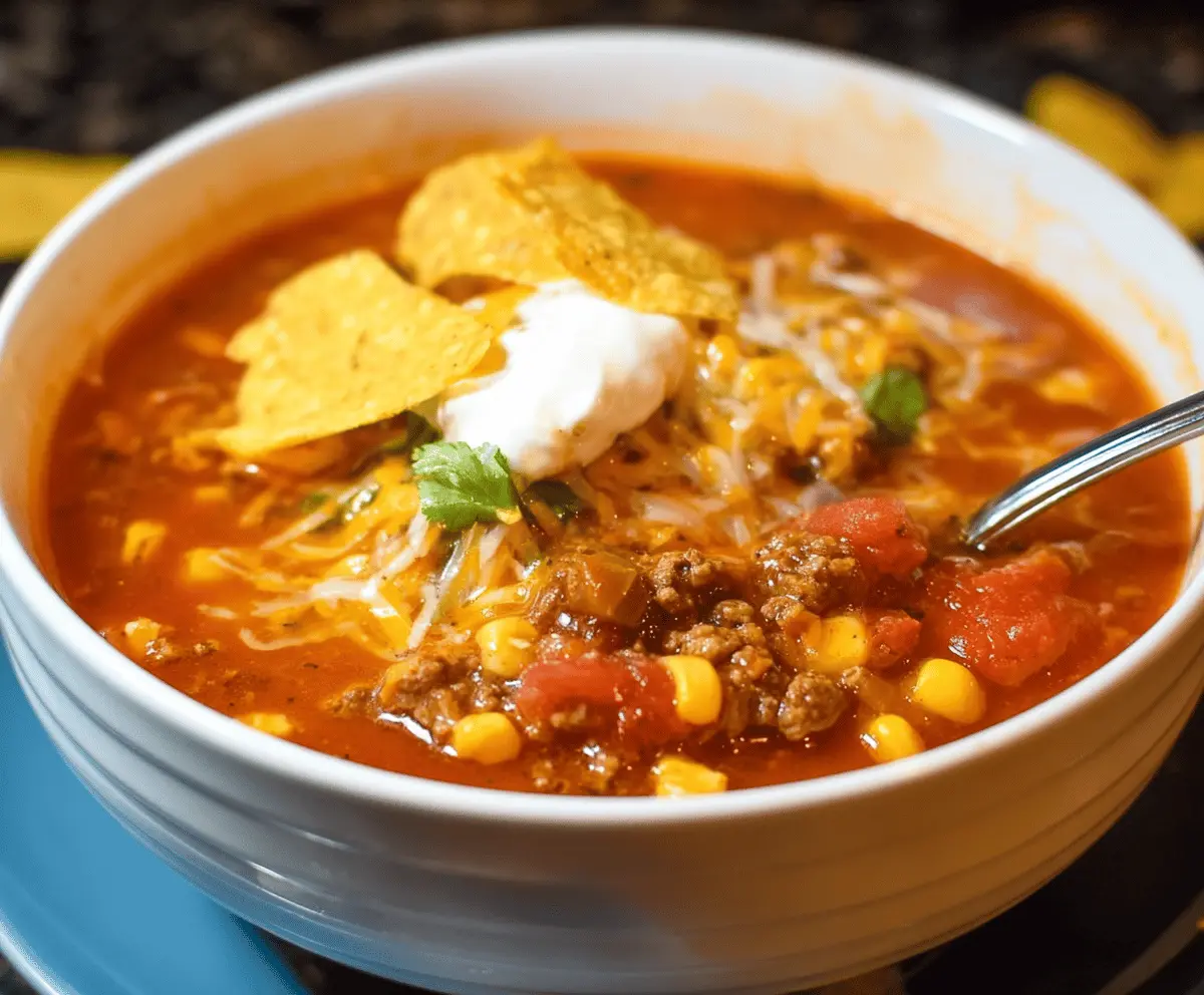 Serve the soup hot in bowls. Top it with shredded cheddar cheese, a dollop of sour cream, and a sprinkling of Fritos for some crunch. If you like, toss on some chopped cilantro for a fresh finish. Enjoy this comforting, zesty Taco Soup that captures all the flavors of tacos in each comforting spoonful!