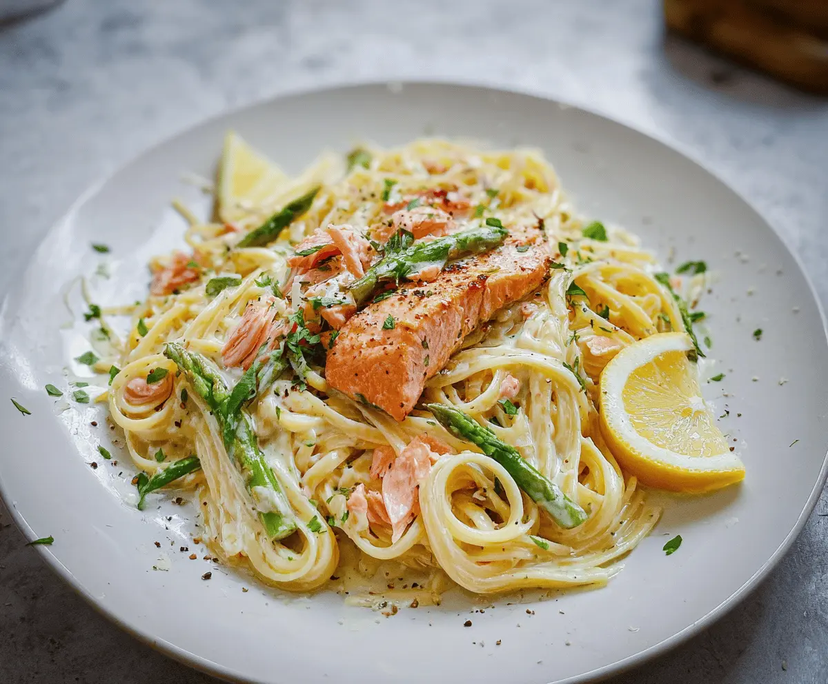 Tender salmon and asparagus tossed with fettuccine in a bright, garlicky lemon cream sauce for an easy, cozy pasta dinner.