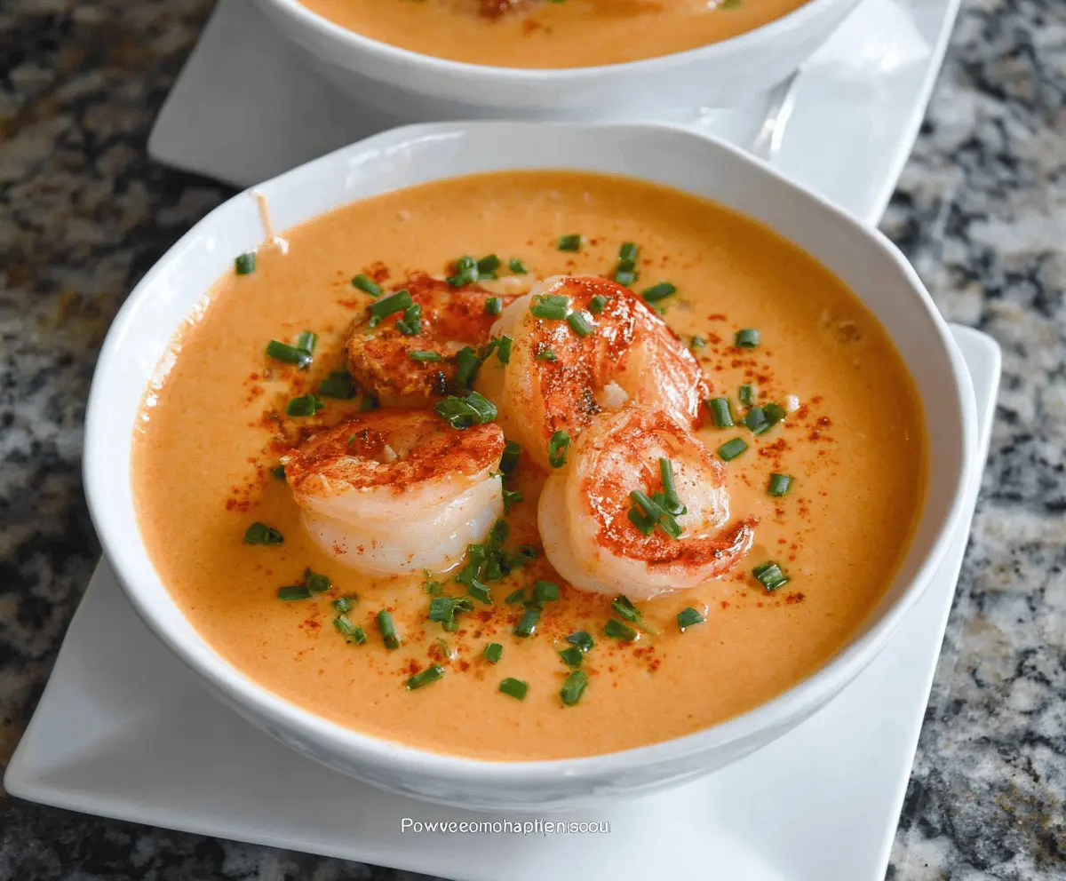Pour the bisque into bowls, topping each with the reserved shrimp and a sprinkle of chopped fresh chives or parsley along with a touch of paprika. Serve with toasted bread slices for a delightful finish!
