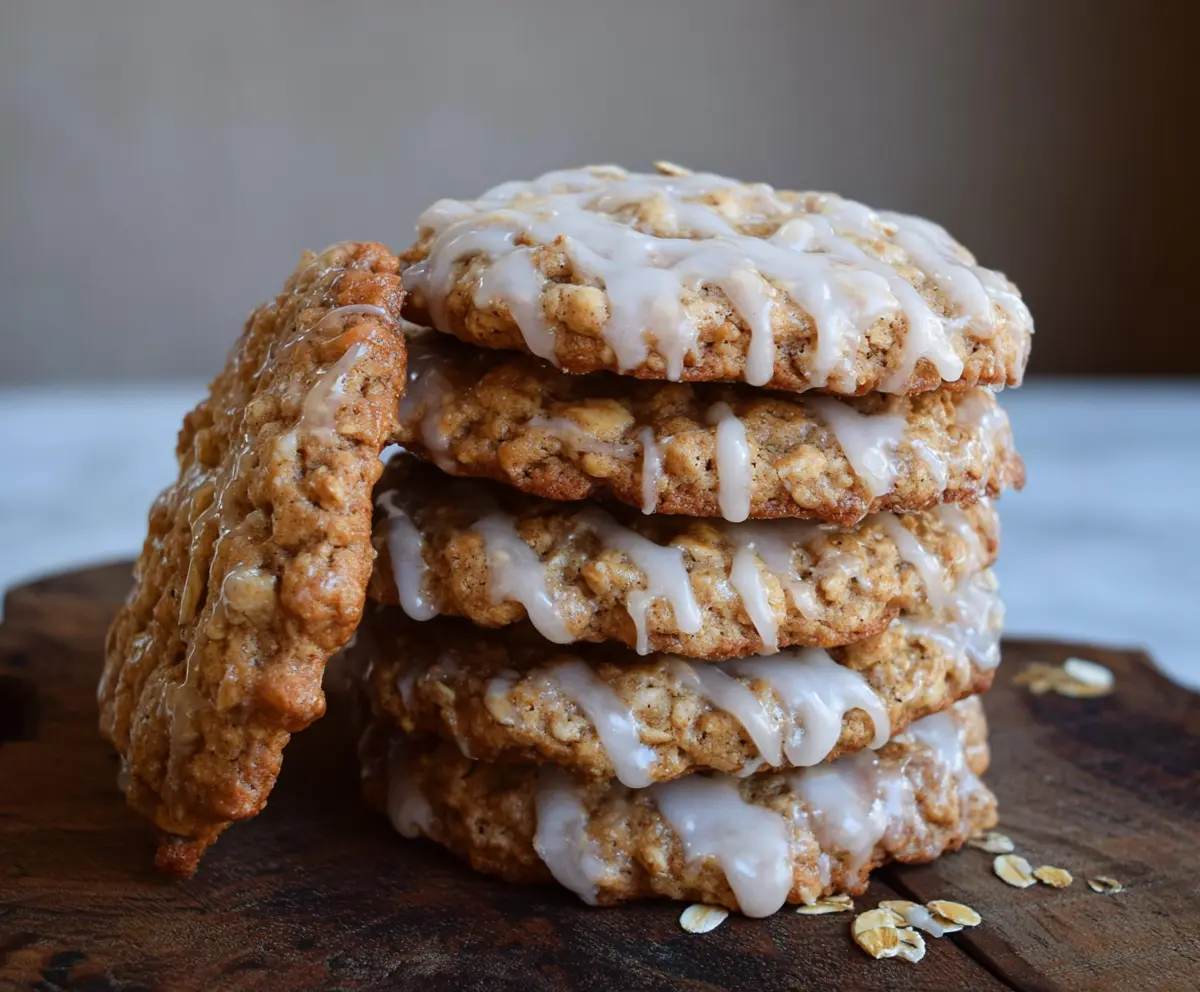 Once your cookies are completely cool, drizzle the glaze over the top. Let the glaze set for a few minutes before you dig in. Enjoy your delicious, chewy oatmeal cookies with that sweet vanilla glaze!