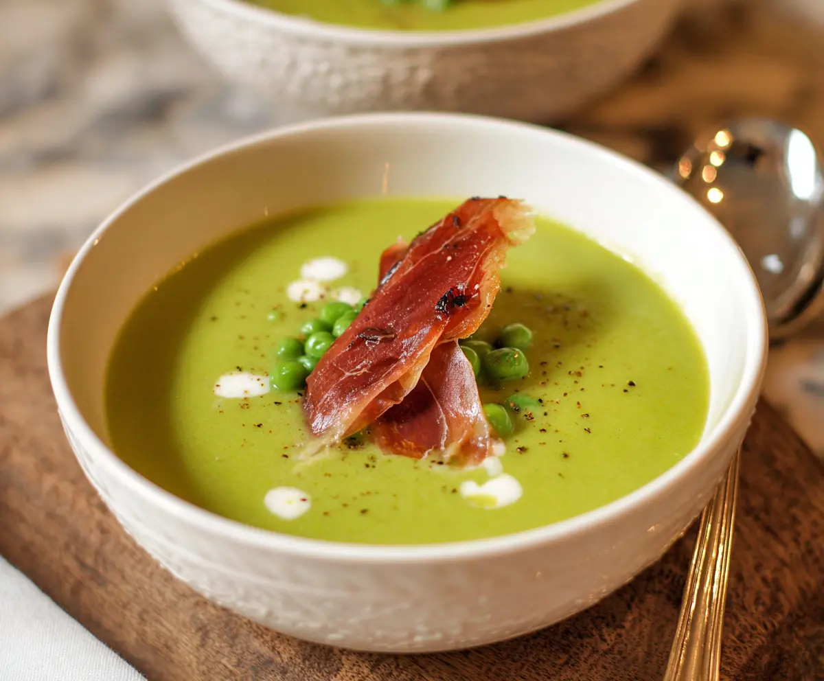 Now it’s time to ladle the soup into bowls. Add a generous dollop of crème fraîche or cream in the center, sprinkle some additional fresh peas for garnish, and top with a slice of that crispy prosciutto you made earlier. For an extra touch, serve it with crusty bread or crostini on the side.