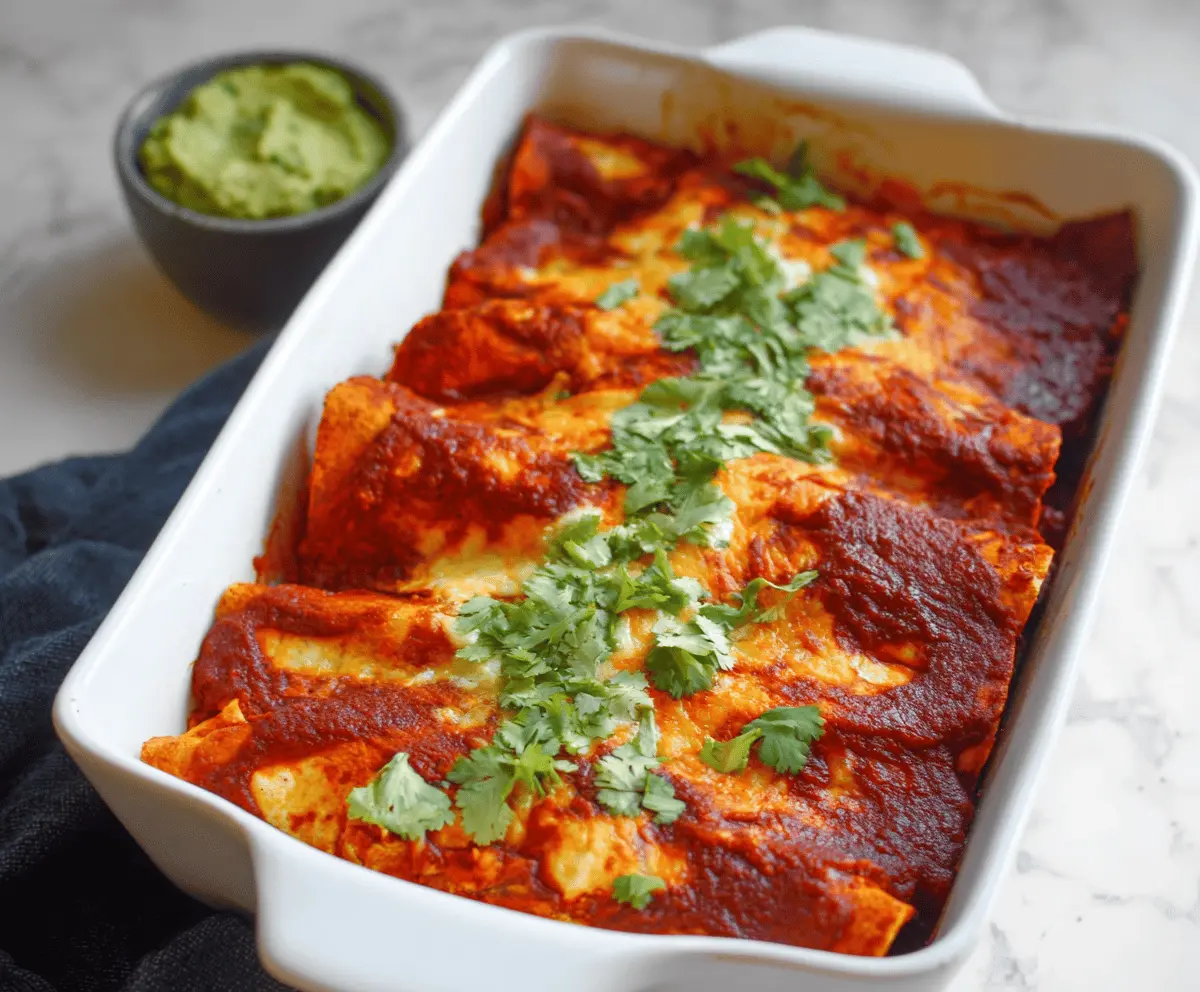 Once the enchiladas are done, take them out of the oven. Spoon the avocado topping over each enchilada and garnish with fresh cilantro. Serve warm with lime wedges on the side, ready for squeezing!