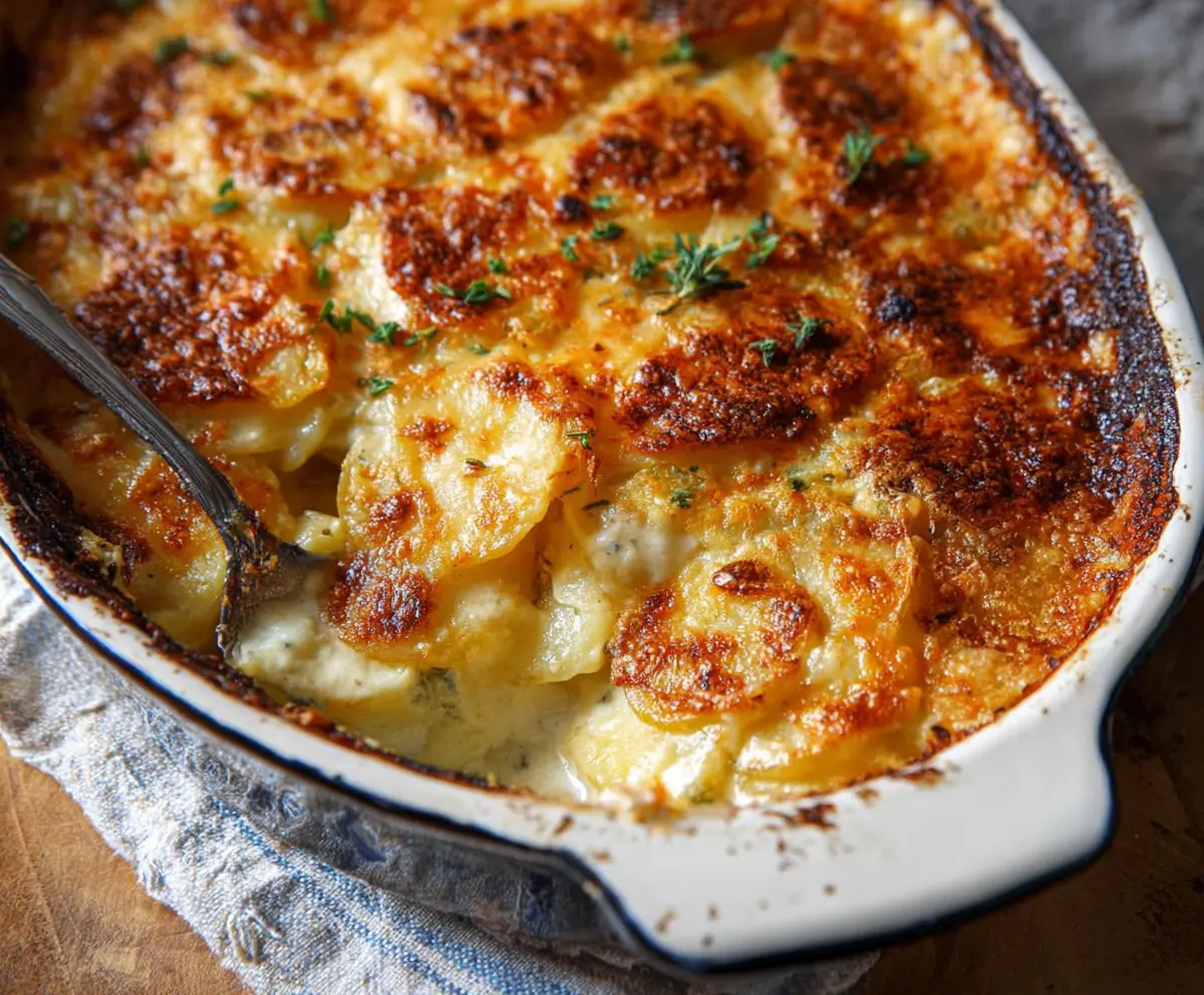 Once done, take the scalloped potatoes out of the oven and let them rest for about 10 minutes. This helps the dish set a bit, making it easier to serve. Before you dig in, feel free to garnish with fresh parsley or thyme for a pop of color and flavor.