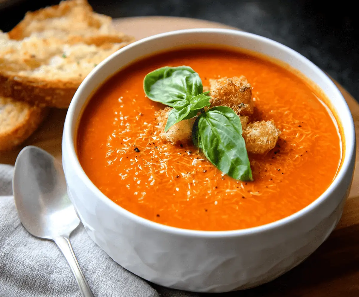 Ladle the hot soup into bowls. Top with croutons for crunch, a few fresh basil leaves, and sprinkle some grated parmesan cheese if you like. It adds a lovely touch!