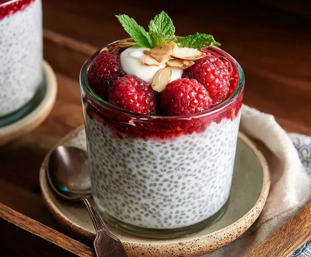 Scoop the pudding into individual serving jars or bowls. Top each one with fresh raspberries, a sprinkle of slivered almonds, and a mint leaf to make it look fancy!