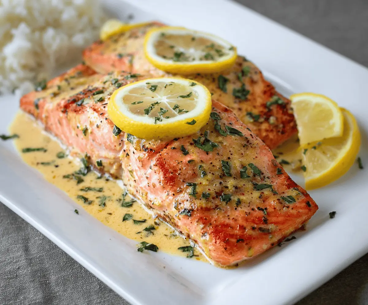 Bright, zesty salmon fillets baked with a lemony Dijon, garlic, and thyme sauce—an easy weeknight dinner that’s on the table in about 20 minutes.